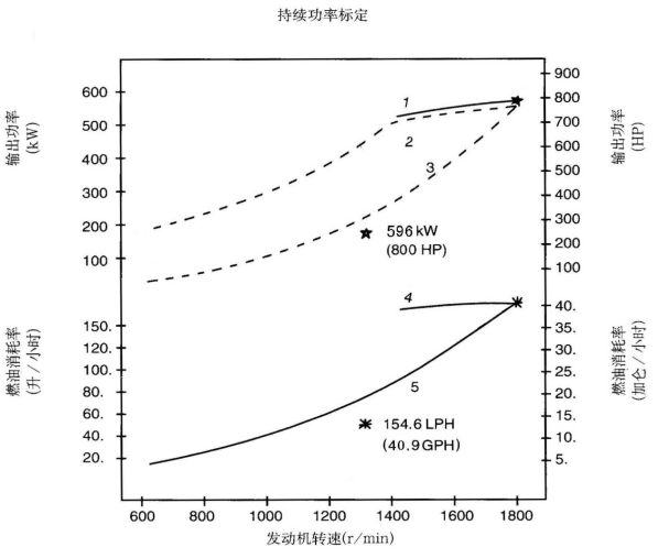 標定條件:功率標定是基于ISO8665標準規定的條件:大氣壓力為100kPa (29.612英寸汞柱),環(huán)境溫度為25℃(77°F),相對濕度為30%。螺旋槳軸功率為按97%扣除齒輪箱損失后的凈功率。燃油消耗是基于使用比重為838.9g/l(7.001磅/加侖),LHV為42780kJ/kW(18390Btu/lb)的35°API燃油。 1. 制動(dòng)功率 kW(HP) 4. 軸功率對應的燃油消耗 2. 扣除齒輪箱損失后的軸功率 kW(HP) 5. 螺旋槳推進(jìn)曲線(xiàn)對應的燃油消耗 3. 螺旋槳推進(jìn)曲線(xiàn) 持續功率:這種功率標定的發(fā)動(dòng)機允許在全負荷工況下連續不斷地使用。這種功率為ISO3046標準功率 * 對非LTA發(fā)動(dòng)機,其燃油耗高1-3%。 | ||||||