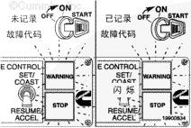 指示燈閃爍每個(gè)故障代碼兩次,將顯示故障代碼。為了快速跳到故障代碼,請將怠速調整開(kāi)關(guān)(如果配備)暫時(shí)撥到 "(+)" 位置。將怠速調整開(kāi)關(guān)(如果配備)暫時(shí)撥到 "(-)" 位置,就可以返回到故障代碼。如果只記錄了一個(gè)現行故障,即使將開(kāi)關(guān)撥到 "(+)" 或 "(-)" 位置,控制系統也會(huì )繼續顯示同一個(gè)故障代碼。