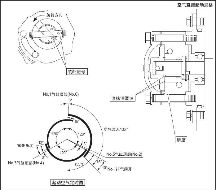 注: 三菱S6R柴油發(fā)動(dòng)機分配閥組裝時(shí),要對準裝配記號。安裝出錯時(shí),360° 起動(dòng)空氣定時(shí)會(huì )發(fā)生錯亂導致不能起動(dòng)。