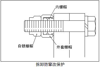 防竄改保護螺帽有2重構造,不能夠簡(jiǎn)單的旋轉拆除。拆除時(shí),必須切斷破壞筒形外螺帽,然后才能拆卸內螺帽。