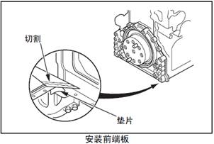 (4) 確認前端板的下部和三菱S6R柴油發(fā)動(dòng)機三菱S6R柴油發(fā)動(dòng)機曲軸箱體的底部是否平齊。小心地剪除露出外面的墊片邊緣。