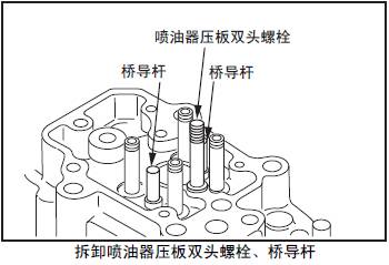 拆卸時(shí)參照「三菱S12柴油發(fā)動(dòng)機本體的檢測、修理」的「三菱S12柴油發(fā)動(dòng)機噴油器壓板雙頭螺栓、橋導桿的檢測,更換」項。