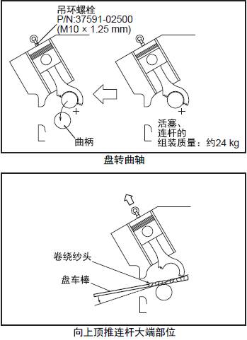 注: 用紗頭、橡膠等卷繞撬棒,避免損傷曲柄銷(xiāo)和三菱S12柴油發(fā)動(dòng)機連桿大端。