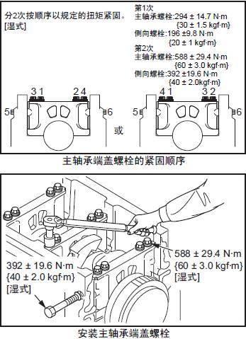 (7) 最后端除外的三菱S12柴油發(fā)動(dòng)機主軸承瓦端蓋螺栓按照圖示順序,旋緊至規定扭矩。