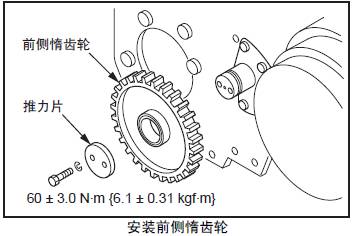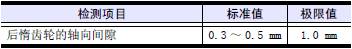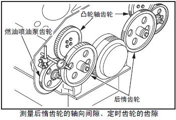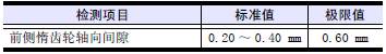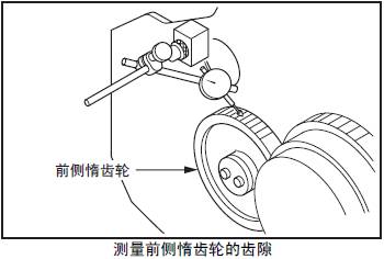 測量前側惰齒輪的齒隙,將千分表的表頭放置在齒輪節圓的圓周線(xiàn)上,與齒面垂直接觸,測量齒隙量,或在各齒輪的嚙合部分插入厚薄規進(jìn)行測量。超過(guò)極限值時(shí)更換新的齒輪。