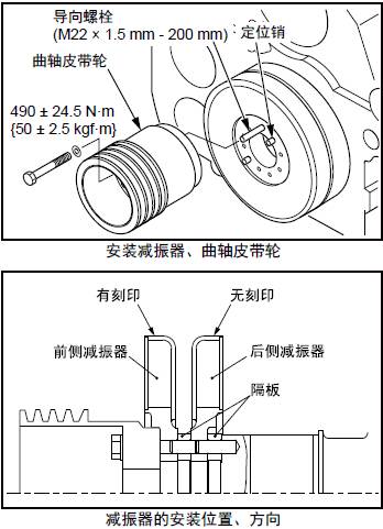 (2) 按照隔板、內側的三菱S12柴油發(fā)動(dòng)機減振器、隔板、外側的三菱S12柴油發(fā)動(dòng)機減振器、三菱S12柴油發(fā)動(dòng)機曲軸皮帶輪的順序,通過(guò)導向螺栓,對準定位銷(xiāo)進(jìn)行安裝。
