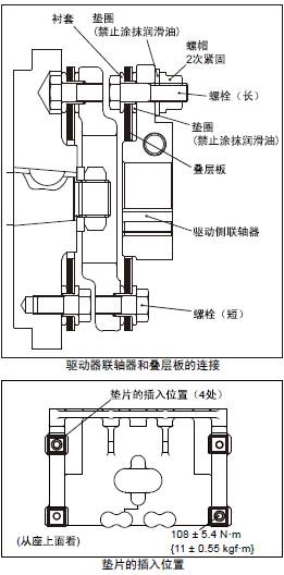 (c) 驅動(dòng)器聯(lián)軸器和疊層板的配合面如有雜質(zhì)嵌入會(huì )引起打滑或損傷,使用前螺栓、襯套和墊圈要清洗干凈。