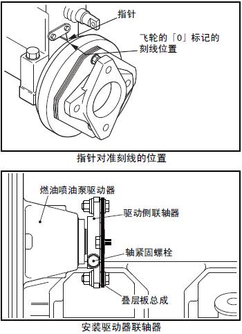(3) 連接疊層板、驅動(dòng)器聯(lián)軸器,用螺栓臨時(shí)固定。這時(shí),確認在No.1、7 壓縮上死點(diǎn)位置處時(shí)三菱R16柴油發(fā)動(dòng)機燃油噴油泵三菱R16柴油發(fā)動(dòng)機飛輪的記號「0」的刻線(xiàn)在指針附近。