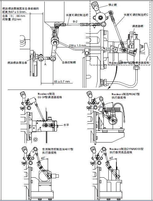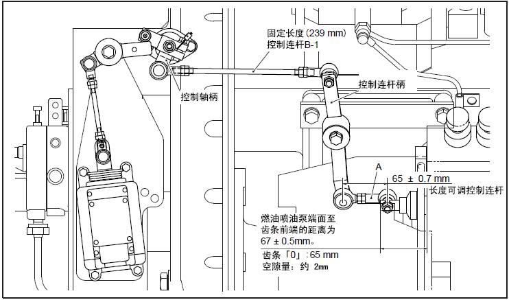 (3) 左氣缸側用可調長(cháng)度控制三菱R16柴油發(fā)動(dòng)機連桿B-2 調整至239 mm 臨時(shí)鎖緊,和有鋸齒孔的停止柄連接。確認兩氣缸側的三菱R16柴油發(fā)動(dòng)機燃油噴油泵齒條處于「0」位置,油門(mén)柄和套管、回程彈簧一起和控制軸的鋸齒孔連接。
