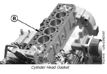 18. Remove cylinder head gasket (B). Inspect for possibleoil, coolant, or combustion chamber leaks. Also,check for evidence of incorrect head gasket beingused.