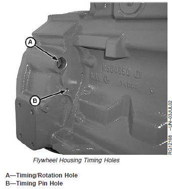 2. Using JDE81-1 or JDE83 Flywheel Turning Tool andJDG1571 or JDE81-4 Timing Pin inserted in flywheel,lock No. 1 piston at TDC compression stroke.