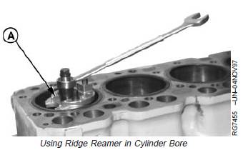6. Remove carbon from liner bore with a scraper or ridgereamer (A). Use compressed air to remove loosematerial from cylinders.