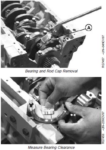 10. Measure rod bearing-to-journal oil clearance withPLASTIGAGEâ before removing piston and rodassembly. Record measurements. (See INSPECTAND MEASURE CONNECTING ROD BEARINGS,later in this group.)