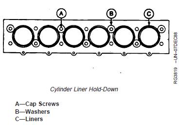 NOTE: Do not rotate crankshaft with cylinder headremoved unless liners are fastened down.