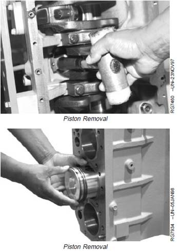 IMPORTANT: Hold onto piston to prevent piston fromdropping. Piston will drop once pistonrings have cleared cylinder liner.If liners are to be reused, be extremelycareful not to let connecting rod hitliner bore when removing piston androd assembly.