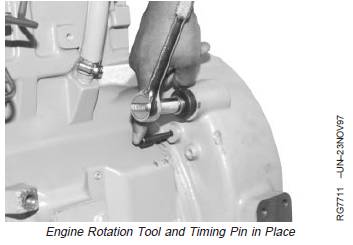 1. Using JDE81-1 or JDE83 Flywheel Turning Tool andJDG1571 or JDE81-4 Timing Pin, lock No. 1 piston atTDC compression stroke.