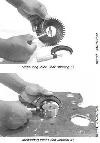 1. Measure idler gear bushing ID and shaft OD todetermine oil clearance. If oil clearance exceedsspecification, replace worn parts.
