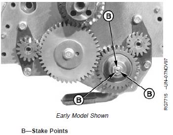 12. Tighten oil pump drive gear retaining nut to specifications. Stake nut to shaft in three places (B). (See INSTALL ENGINE OIL PUMP in Group 060 for oil pump installation.)