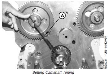 a. With JD254A (JD-254A) Timing Tool resting on nose of crankshaft and center of camshaft (as shown), turn camshaft until timing mark (A) on camshaft gear aligns with timing tool.