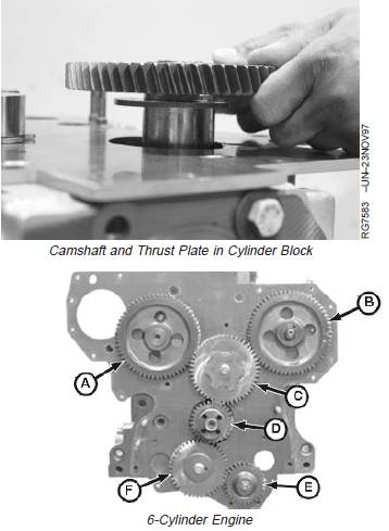 IMPORTANT: DO NOT allow camshaft lobes to drag on camshaft bore or bushing surfaces while installing camshaft. Bearing surfaces may become scratched or scored. Rotate camshaft during installation to avoid obstruction in any bore.