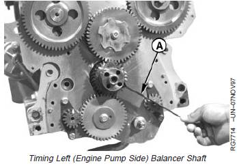 9. Turn left (injection pump side) balancer shaft so timing mark on gear is aligned with JD254A (JD-254A) Timing Tool (A).