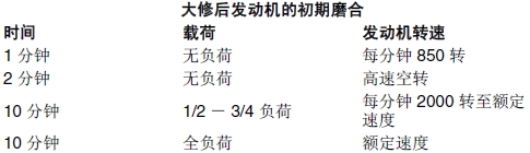 重要提示: 在磨合初期,定時(shí)檢查機油壓力和冷卻液溫度。還應該檢查燃油、機油或冷卻液是否有泄漏跡象。一次全負荷運轉時(shí)間不能超過(guò) 10 分鐘。