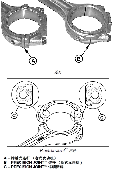 老式John Deere約翰迪爾強鹿柴油發(fā)動(dòng)機的連桿和連桿瓦蓋之間采用傳統的榫槽式連接 (A)。新式John Deere約翰迪爾強鹿柴油發(fā)動(dòng)機具有 PRECISION JOINT™ 連桿和瓦蓋 (B)。
