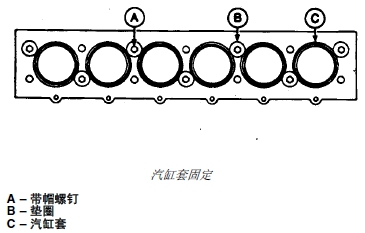 5. 使用短帶帽螺釘(A) 和 3 毫米(1/8 英寸)厚的墊圈(B) 固定汽缸套(C)。在兩個(gè)位置上擰緊每個(gè)襯套的固定螺釘。擰緊帶帽螺釘到 68 牛頓米(50 磅英尺)。