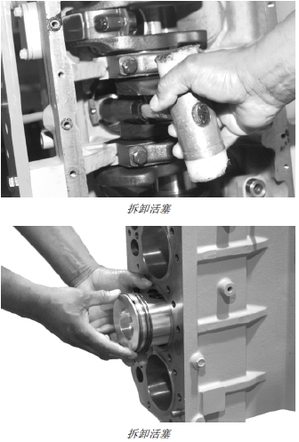 重要提示: 握住活塞,以防活塞掉落?;钊h(huán)脫離汽缸套后,活塞便會(huì )掉落。如果重復使用汽缸套,拆卸活塞和連桿總成時(shí)一定要格外小心,不要讓連桿撞擊汽缸套孔。