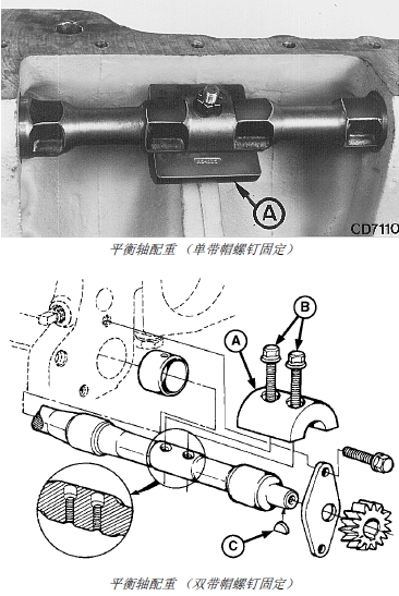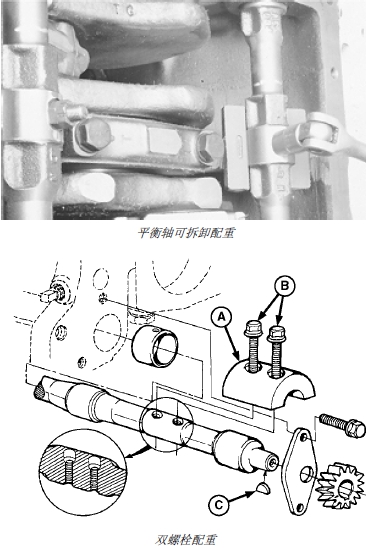 3. 在裝有可拆卸配重 1 (A) 的新式John Deere約翰迪爾強鹿柴油發(fā)動(dòng)機上,必須拆下配重后才能拆卸平衡軸。