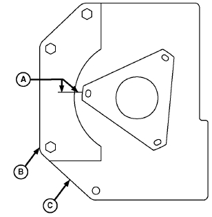 1. 如圖所示,將 DFRG5 鋁模板(B) 放到原前板(C)上。(詳細制作說(shuō)明,參見(jiàn)第 05 部分第 190 章“經(jīng)銷(xiāo)商制造工具”。)安裝和擰緊三個(gè) 3/8-16 帶帽螺釘。