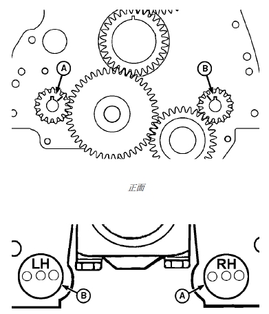 3. 如圖所示,按齒輪正時(shí)標記標識左右平衡軸。