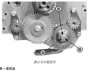 注意: 當John Deere約翰迪爾強鹿柴油發(fā)動(dòng)機鎖定在一號汽缸活塞壓縮沖程上止點(diǎn)時(shí),平衡軸齒輪上的鍵槽 (B) 必須處在 12 點(diǎn)鐘位置。