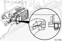 鑰匙開(kāi)關(guān)位于“OFF”(斷開(kāi))位置。 從渦輪增壓器控制閥上斷開(kāi)電氣線(xiàn)束。 為了拆下接頭,將食指放在接頭脫扣裝置上,將拇指放在接頭上,同時(shí)用食指壓脫扣裝置,如圖所示。 向里按脫扣裝置并且抓住插頭用力拉來(lái)拆下接頭,如圖所示。