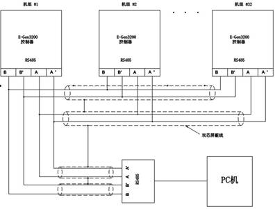 并車(chē)機組的運行狀況可以由 PC遠程監測,并車(chē)機組和 PC間的通信采用 Modbus RS485網(wǎng)絡(luò )。Modbus通信協(xié)議是公開(kāi)的;RS-485網(wǎng)絡(luò )使用 RS-485通信協(xié)議連接線(xiàn),傳送速度為 9600波特率,無(wú)奇偶校驗,有一個(gè)停止位,可使用全雙工 /半雙工通訊;計算機端口使用的 RS-232通信協(xié)議和 E-Gen3000控制器組成的網(wǎng)絡(luò )端口使用的 RS-485通信協(xié)議之間需要一個(gè)轉換器。該轉換由一外置轉換模塊完成,此模塊將從計算機輸入的 9針 RS-232協(xié)議轉換為控制器的 RS-485協(xié)議,稱(chēng)為 RS-232至 RS-485轉換器。在控制器中的聯(lián)機示意圖如下: