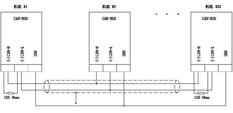 并機系統中的機組之間的起停順序、負載分配、開(kāi)關(guān)閉合時(shí)間等各種功能都是通過(guò)各并機并網(wǎng)并聯(lián)控制器的數據聯(lián)機進(jìn)行通信,然后由控制器進(jìn)行數據處理并發(fā)出相應控制命令,從而實(shí)現對各機組的并車(chē)控制。通信采用 RS-485網(wǎng)絡(luò ),其在并機并網(wǎng)并聯(lián)控制器中的聯(lián)機示意圖如下: