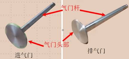 氣門(mén)分為進(jìn)氣門(mén)和排氣門(mén),分別控制進(jìn)氣和排氣,結構相同,進(jìn)氣門(mén)頭比排氣門(mén)頭大。氣門(mén)由氣門(mén)頭和氣門(mén)桿兩部分構成。氣門(mén)頭為圓盤(pán)形,氣門(mén)桿為圓柱形。氣門(mén)桿的尾部成錐形,用以安裝鎖片。氣門(mén)與氣門(mén)座共同形成密封面來(lái)密封氣缸內氣體。