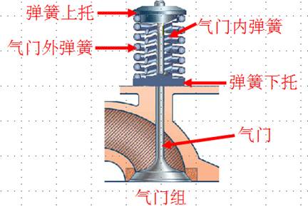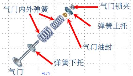 2、氣門(mén)組:氣門(mén)組包括氣門(mén)、氣門(mén)座、氣門(mén)導管、氣門(mén)彈簧、氣門(mén)鎖夾、氣門(mén)油封等零件。