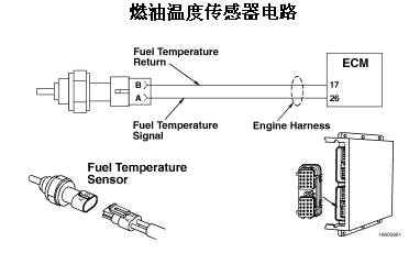 ECM 使用燃油溫度傳感器監測燃油溫度。ECM 監測觸針 26 上的電壓并將它轉換成溫度值。燃油溫度數值由 ECM 用于發(fā)動(dòng)機保護系統。