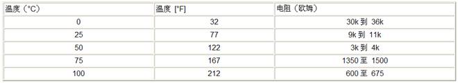 傳感器的電阻值隨溫度變化。如果傳感器的功能正常,觀(guān)察的讀數應與下表數據進(jìn)行對比。