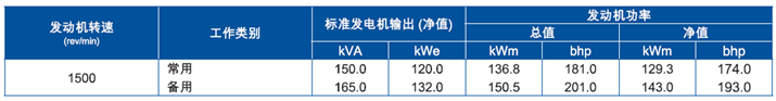 上表所有額定功率數據均為配備標準尺寸風(fēng)扃與驅動(dòng)器比率的發(fā)動(dòng)機,ISO/TR 14396/IS0 8528條件下操作時(shí)數據。有關(guān)上述條件以外操作的數據請咨詢(xún)珀金斯公司,Perkins提供的性能公差為±5%。電氣參數假設功率因數為0.8與發(fā)動(dòng)機效率90%。