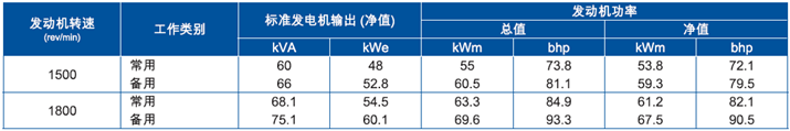 上表所有額定功率數據均為IS0 8528/1、IS0 3046/1:1986、BS5514/1條件下的發(fā)動(dòng)機性能。在其他條件下工作時(shí),性能可能降低。有關(guān)上述條件以外工作的數據,請向Perkins公司咨詢(xún)。Perkins提供的發(fā)電機輸出功率為標準數據,并根據平均標準交流發(fā)電機效率及0.8功率因數(cos.q)厘定。
