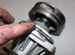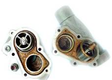 (5)水封 作用是密封冷卻液以免泄漏,同時(shí)將冷卻液與水泵軸承隔離,以保護軸承。目前水泵上已經(jīng)廣泛使用了雙層陶瓷水封,2片同軸安裝的陶瓷水封被螺旋彈簧壓緊貼在一起。與橡膠水封相比,陶瓷水封更耐磨損,使用壽命更長(cháng),但是也存在容易被冷卻液中的硬質(zhì)顆粒擦傷的缺點(diǎn)。雖然水封的加工得到了不斷的改進(jìn),但是水封損壞導致水泵漏水仍然是水泵損壞的主要原因。