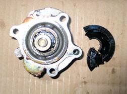 (1)葉輪損壞 葉輪損壞的常見(jiàn)形式有葉輪開(kāi)裂、葉輪從泵軸上松脫或葉輪腐蝕,葉輪腐蝕一般不會(huì )造成發(fā)動(dòng)機故障。葉輪開(kāi)裂或葉輪從泵軸上松脫后,冷卻液循環(huán)速度變慢,容易引起發(fā)動(dòng)機溫度過(guò)高的故障。損壞的葉輪在旋轉時(shí)還可能撞擊水泵殼體,造成殼體碎裂。