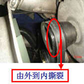 造成此故障的現象:發(fā)電機皮帶被撕裂成條狀,具體圖片參見(jiàn)下圖 造成此故障的原因分析:發(fā)電機皮帶輪與風(fēng)扇皮帶輪不在同一個(gè)平面上,另外發(fā)電機皮帶輪與風(fēng)扇皮帶輪的倒角過(guò)小,導致皮帶被撕成條狀。 此故障的維修解決方法:更換發(fā)電機皮帶、皮帶輪或調整皮帶輪在同一個(gè)平面上。通常是在發(fā)電機的安裝支架上加墊片,將發(fā)電機向前移動(dòng)1-2毫米。