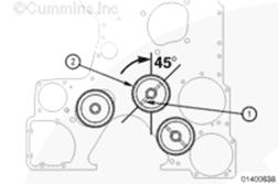 對準康明斯KTA柴油發(fā)動(dòng)機凸輪軸惰輪軸 (2),以便使軸 (1) 的油道處于所示的垂直線(xiàn)的順時(shí)針45 度處。