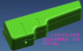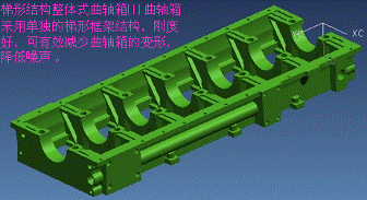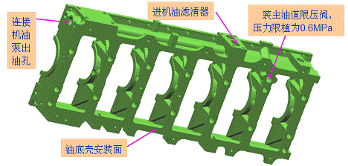 玉柴氣缸體-底面視圖:主油道通副油道的過(guò)渡由主軸承孔開(kāi)槽來(lái)實(shí)現,不必另外布置油道,結構簡(jiǎn)單。