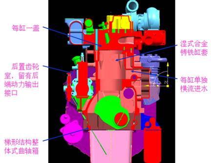整體梯形結構曲軸箱,剛度好,有效減少曲軸箱變形,降低噪聲。 采用每缸一蓋結構,制造性好,廢品率低,維修性好。 內冷油道活塞、新型活塞環(huán)和缸套滿(mǎn)足了發(fā)動(dòng)機性能和可靠性的要求,有效降低機油耗。 油、氣獨立回流和旋風(fēng)式油氣分離技術(shù)使油、氣分離徹底。 后置齒輪室,使后端取力方便,并且使發(fā)動(dòng)機外形更窄,可以適配各種重型車(chē)底盤(pán)。