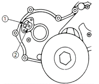 • 順時(shí)針?lè )较蜣D到曲軸,使凸輪軸正時(shí)觀(guān)察孔指針①和凸輪軸正時(shí)齒輪標記“O”對齊