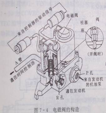 ECU控制電磁閥調節R孔的回流量從而控制控制A通往時(shí)間控制器的油壓控制調節活塞位置來(lái)實(shí)現噴油提前調節。